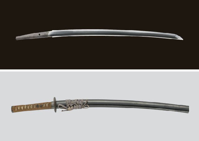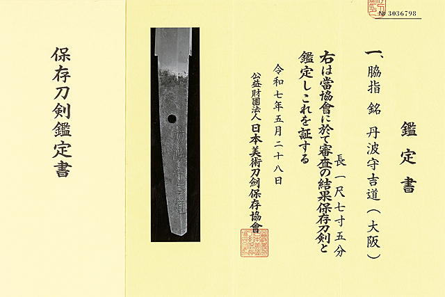 刀身/刃長53.0cm 反り1.4cm 元幅2.8cm 先幅2.0cm 銘「丹波守吉道」 日本美術刀剣保存協会保存刀剣鑑定書(令和7年) 銃砲刀剣類登録証 白鞘無 拵/全長約82.5cm 縁に在銘「宗與(花押)」 小柄欠