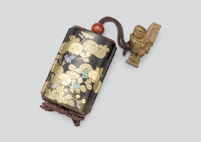 【Lot0092】 蒔絵枝菊文印籠 附)木彫出前持根付