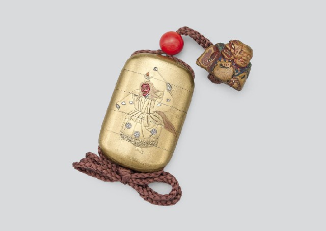 【Lot0095】 蒔絵芝山象嵌能舞文印籠 附)木彫人物根付