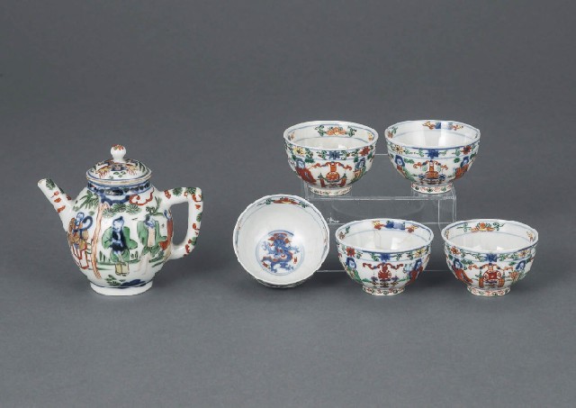 五彩人物文茶器/H9.8×W10.5cm 高台内に描き銘「大明萬暦年製」 五彩人物文盃(5点)/H4×W6.3(各)cm 各高台内に描き銘「萬暦年製」 箱付