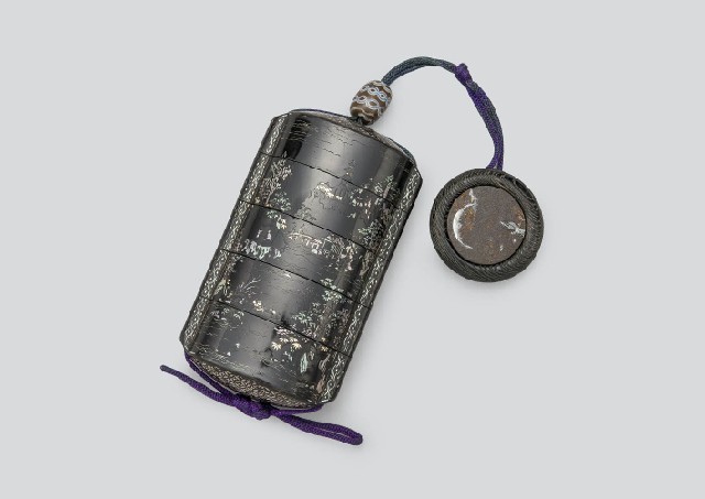 杣田細工螺鈿山水人物文印籠 附)彫金鏡蓋根付