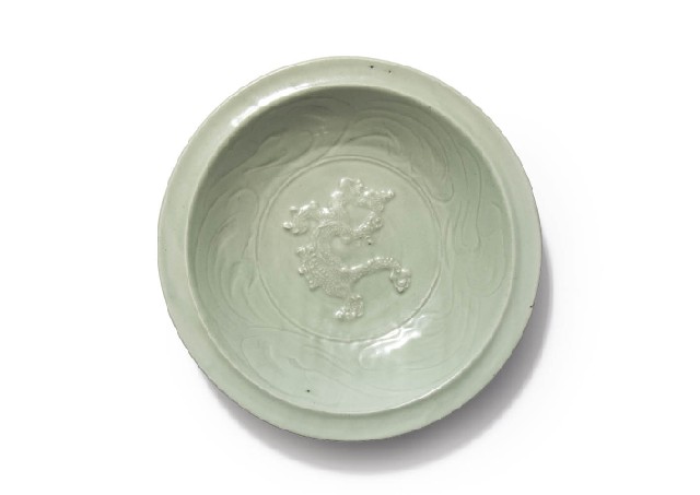 龍泉窯青磁貼花雲龍文水盤