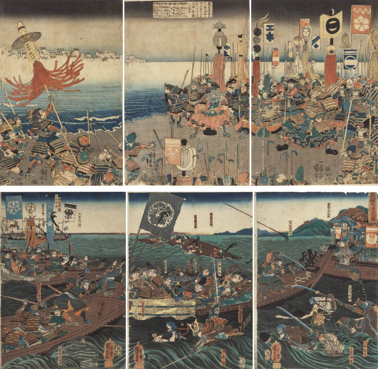 木版 34.9×24.4~37.2×25(シート)cm 三枚続数組含む 数枚に落款と印共に版上、版上落款、版元印、極印、年月印、名主双印 1枚に改印、名主印 数枚に紙による裏打ち ※詳しいコンディションについてはお問い合わせください。