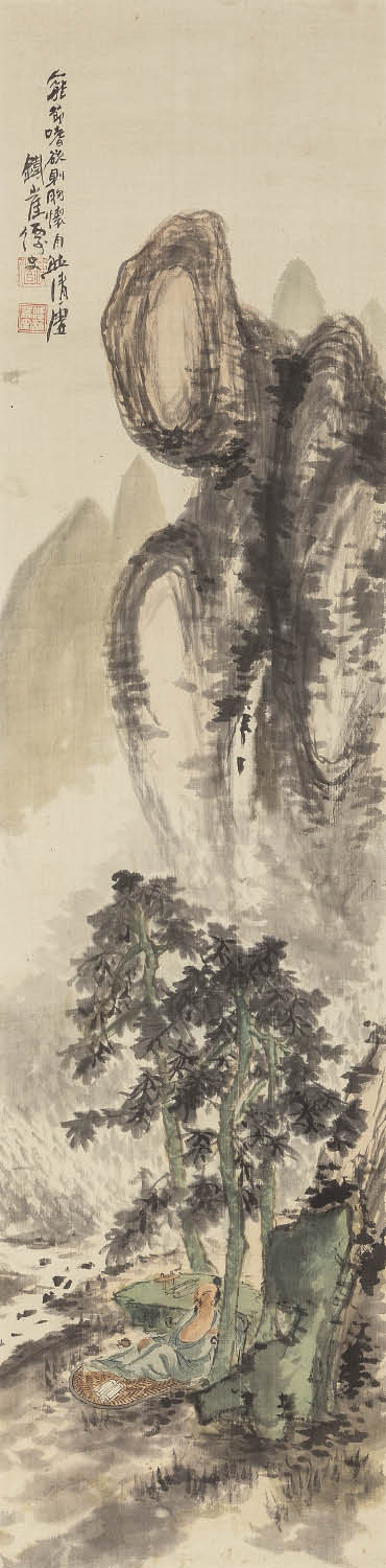 絖本・墨彩 138.8×34.7cm 落款と印有 軸装 画面全体に薄いヤケ、所々にシミ、数ヶ所にわずかなシワ 箱付