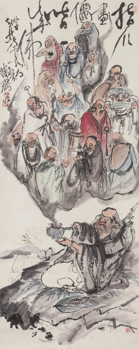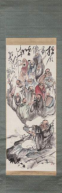 紙本・彩色 141.0×56.5cm 落款と印有 軸装 画面全体に薄いヤケ、数ヶ所に薄いシミ、シワ、わずかなヨゴレ、ヤブレ 「安藤耕斎」鑑題板