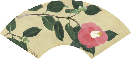 紙本・彩色 18×50.7(扇面型)cm 落款と印有 共シール 画面数ヶ所に小さなシミ、浅いヒビ、1ヶ所にわずかな絵具の浮き、修復 額付*