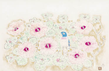 紙本・彩色 12号 落款と印有 画面全体に薄いヤケ、数ヶ所にシミ 共板付 額付