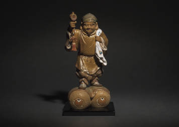 木彫に彩色 H31.6×W15.8×15.9cm(台座含む) 側部に刻銘 作品所々にシミ、1ヶ所にワレ 共箱 ガラスケース付