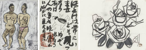 「須田剋太鑑定委員会」鑑定書 他は【ほとけは常に】(色紙に墨・鉛筆 40.8×31.7(色紙)cm サインと印有 画面全体に薄いヤケ)【バラ】(紙にグワッシュ・パステル 25.7×34.6(紙)cm サインと印有 画面全体に薄いヤケ) 全て額付
