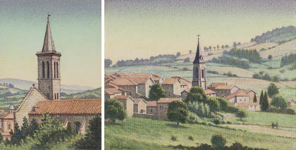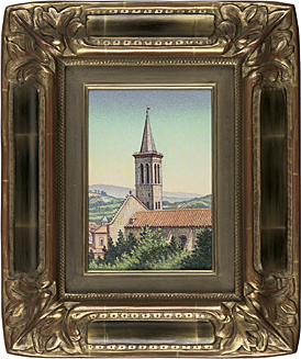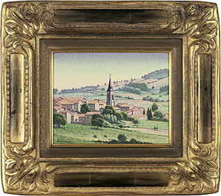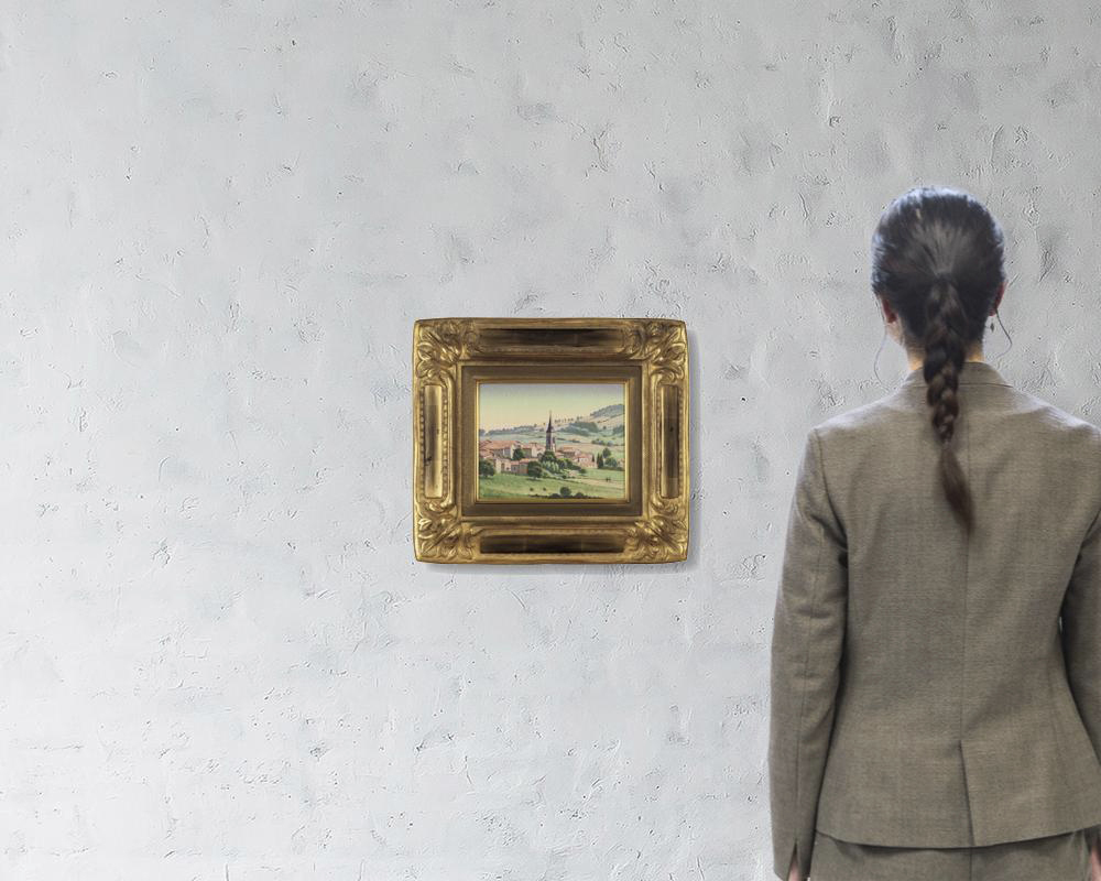 平成13年(2001年) キャンバスに油彩 サムホール サイン有 キャンバス裏にもサイン、タイトル、年記 もう1点は【塔のある村(フランス・ボジョレ)】(平成8年(1996年) F2号 「東京梅田画廊」シール 他は表題と同データ) 2点共額付