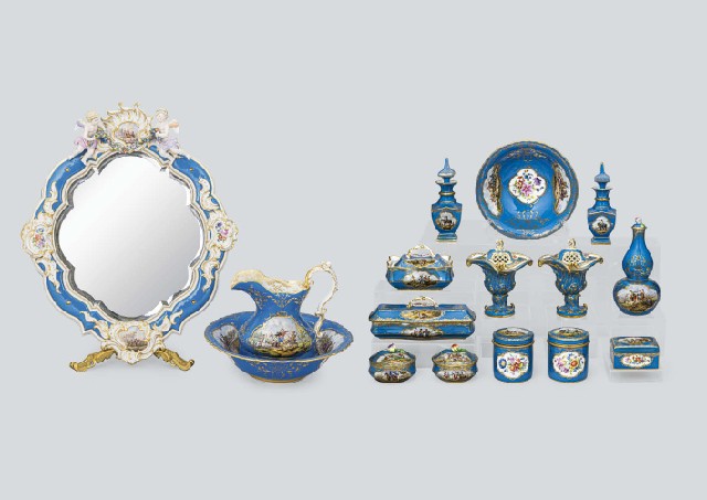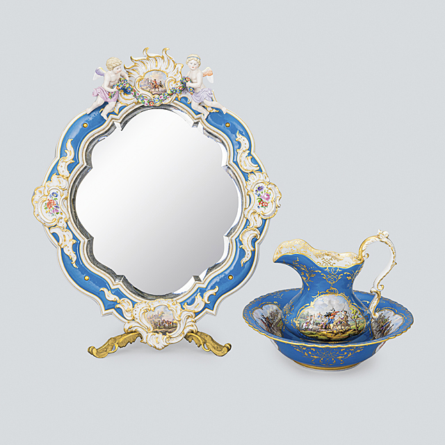 1924年以前 ピッチャー/H24.6cm 栓付瓶2点/H17.2cm ポプリポット2点/H15.5cm 蓋付花瓶/H19.5cm 蓋物各種7点/H4.6-8.7cm 鉢各種2点/H9×D32.7・H6.5×D21.1cm 大の縁にクラック 装飾鏡/H57.5×W49.5×30.5cm いずれも窯印有