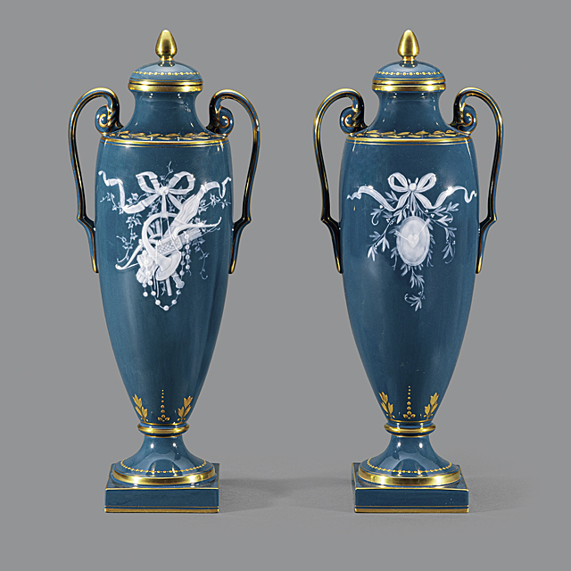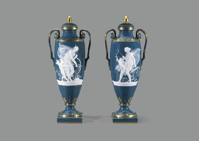 パテ・シュール・パテ女神と天使文蓋付飾り壺(1対)