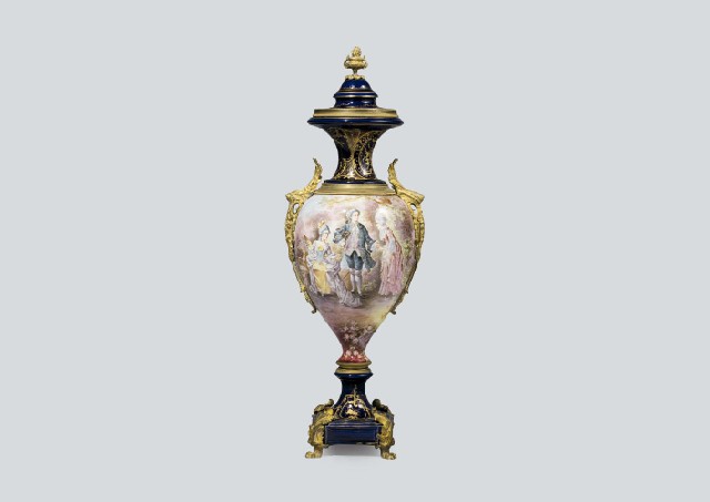 【Lot0232】 コバルト中世人物文蓋付飾り壺