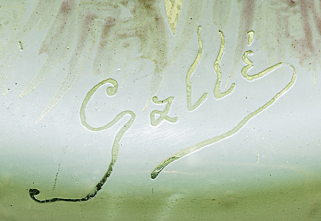 H36.3cm 粉ガラス挟み込み、ウランガラス、被せガラス、酸化腐蝕彫り、エナメル彩 側部に陰刻サイン 脚部の金具にホールマーク(ミネルヴァ)有