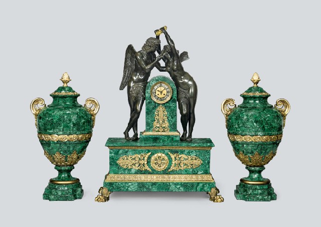マラカイトマントルクロックセット 「クピドとプシュケ」(3点1組)
