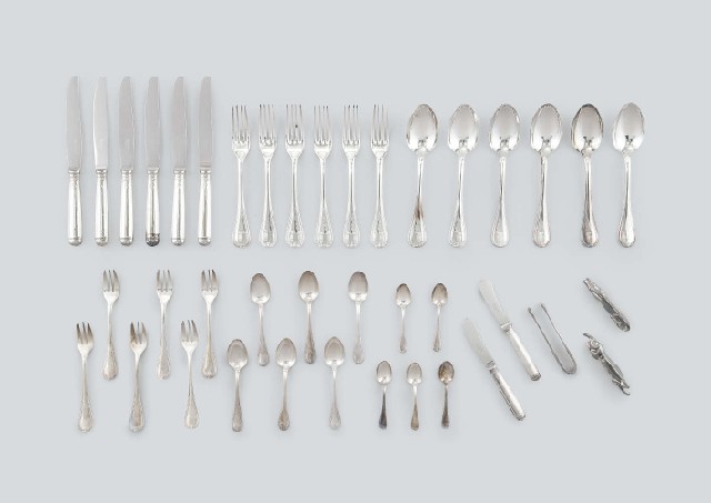 シルバープレート ナイフ6点/L16cm フォーク各種12点/L16-20.4cm スプーン各種17点/L10-20.6cm バターナイフ2点/L16.7cm ナイフレスト各種2点/L9.6-11.2cm シュガートング/L11.3cm いずれも商標有