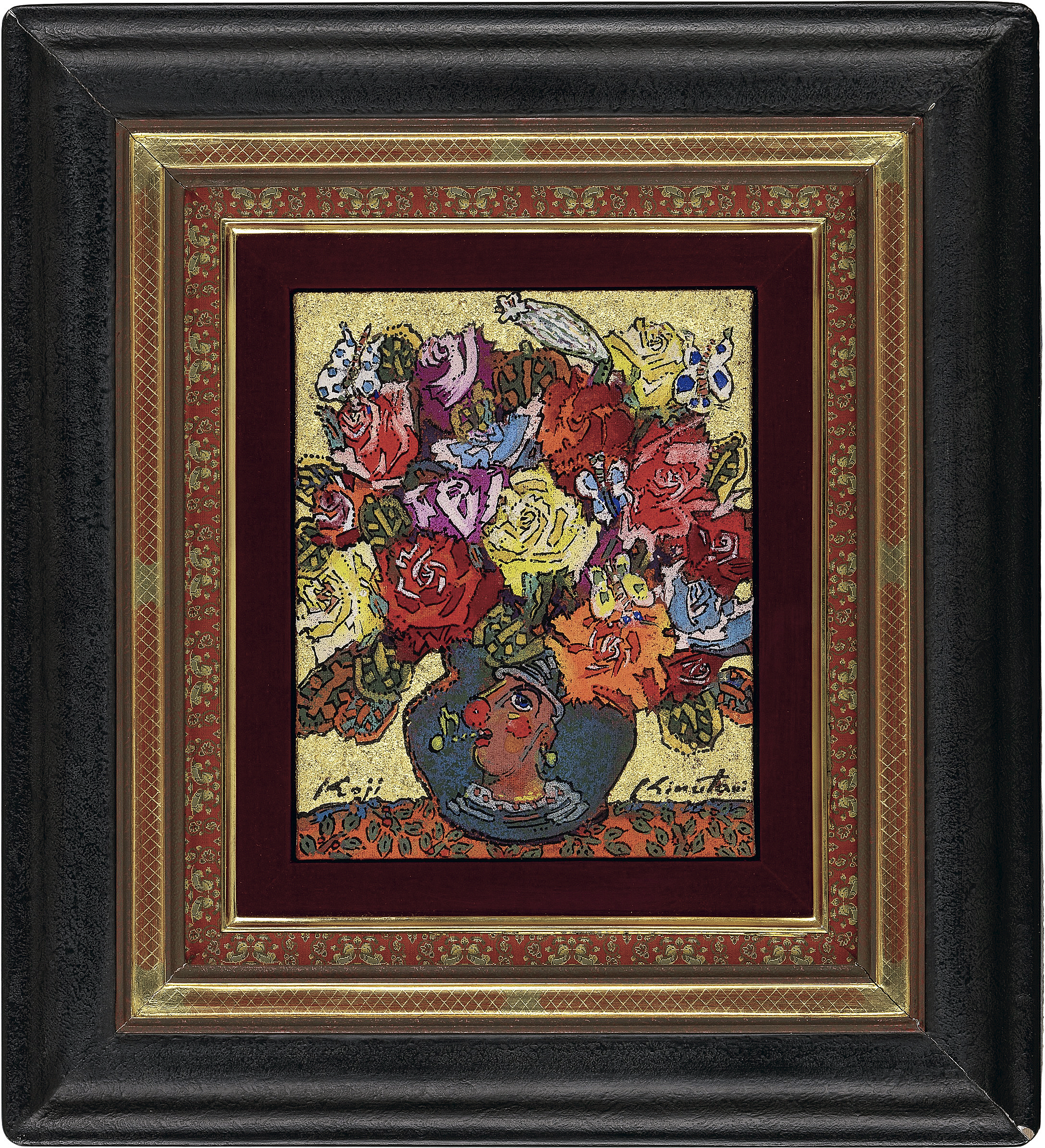 キャンバスにミックストメディア 27×22cm(F3号) 画面下部にサイン キャンバス裏にもサインと拇印、タイトル 額付