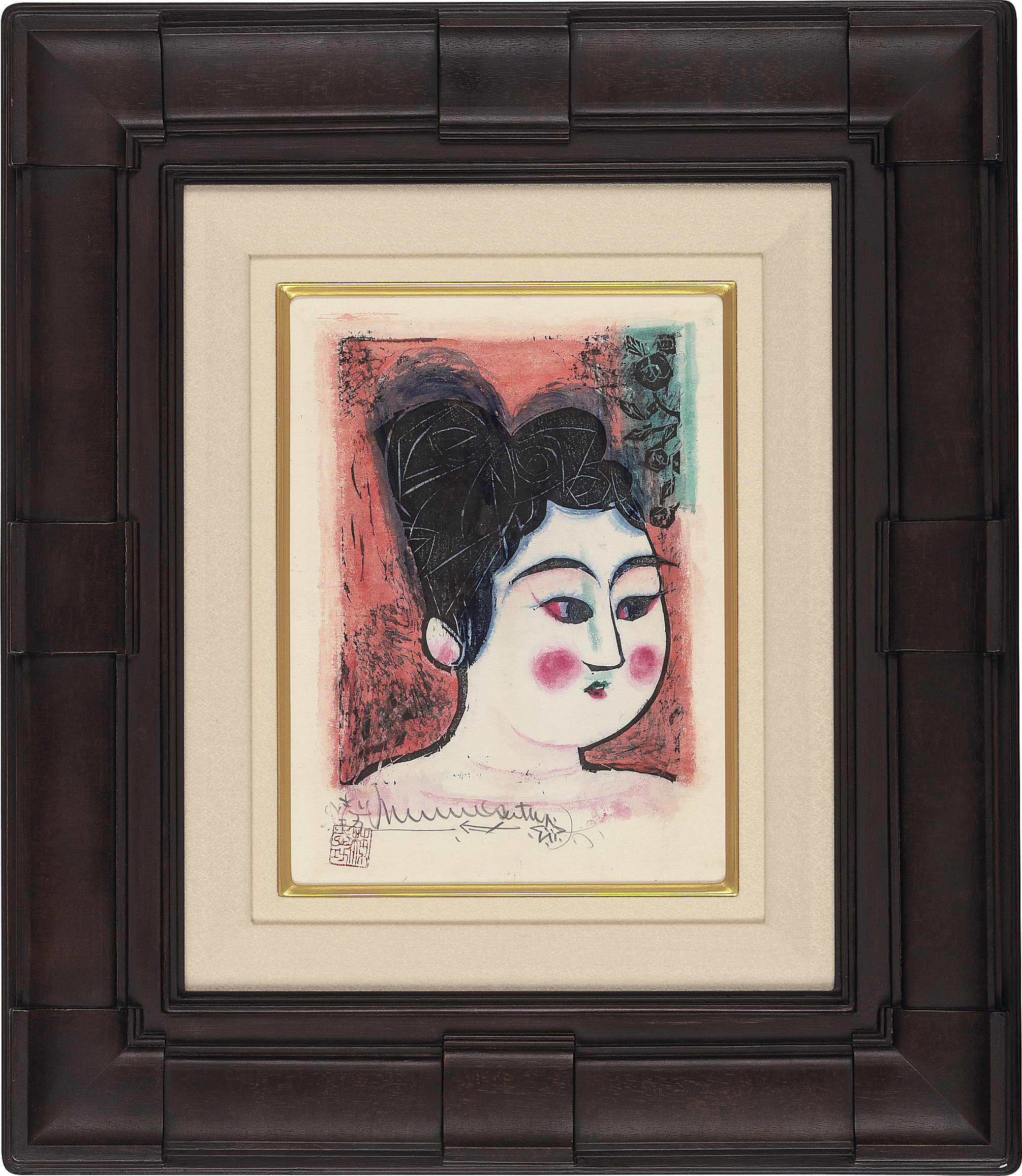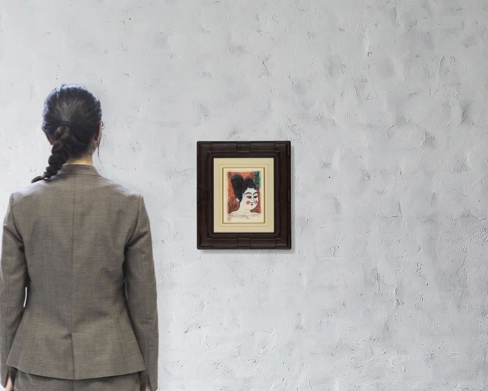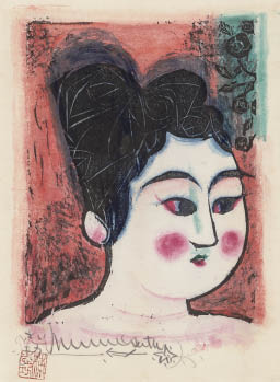 講談社7巻No.108 1959年 板画に手彩・裏手彩 25.5×19.3cm シートサイズ 39.5×31.8cm マージン左下にサインと印 「棟方巴里爾」鑑題シール 和紙とパネルによる裏打ち 額付
