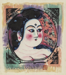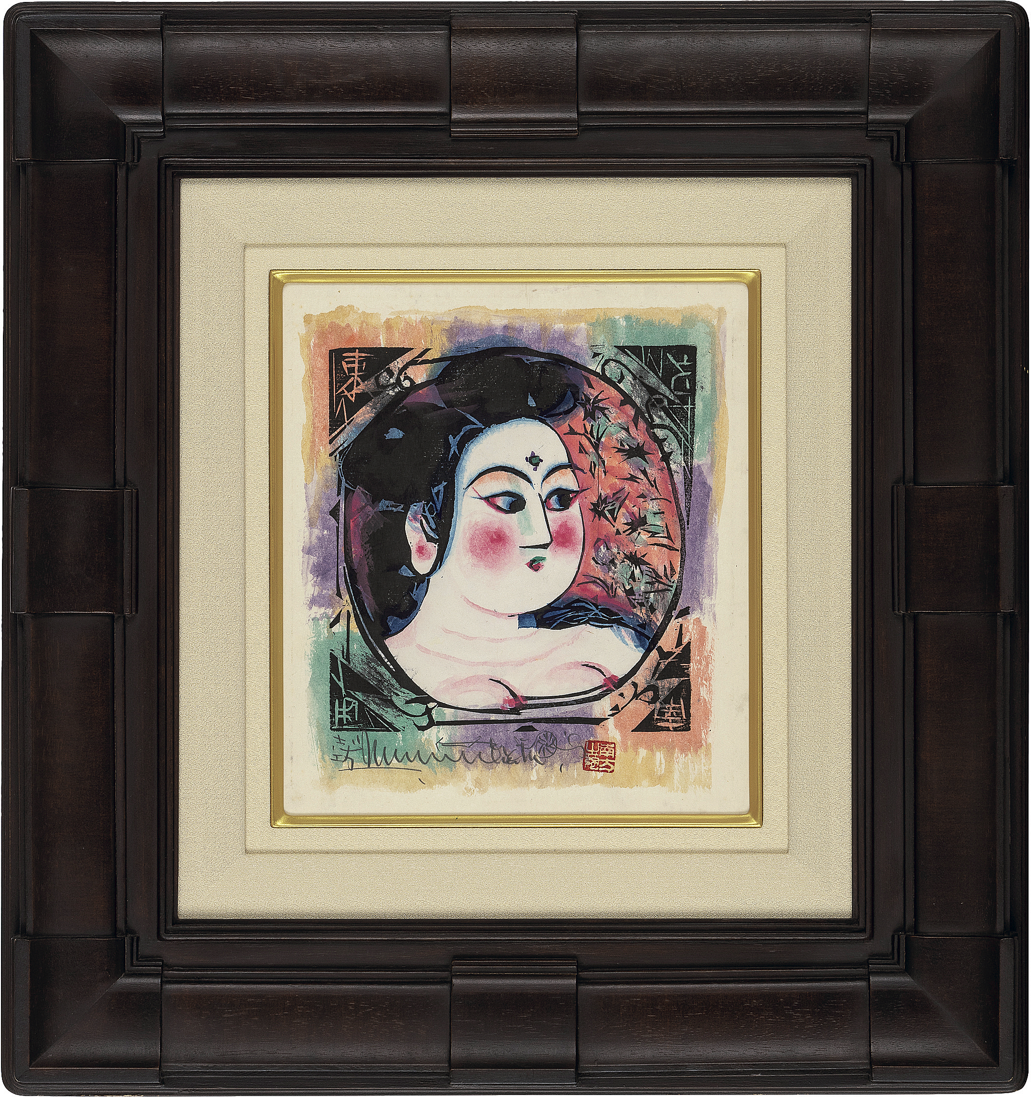 講談社8巻No.70 1968年 板画に手彩・裏手彩 23.2×22cm シートサイズ 38.5×30cm マージン左下にサイン、右下に印 共シール(タイトル「B「なでしこ」の柵」) 和紙とパネルによる裏打ち 額付