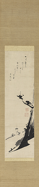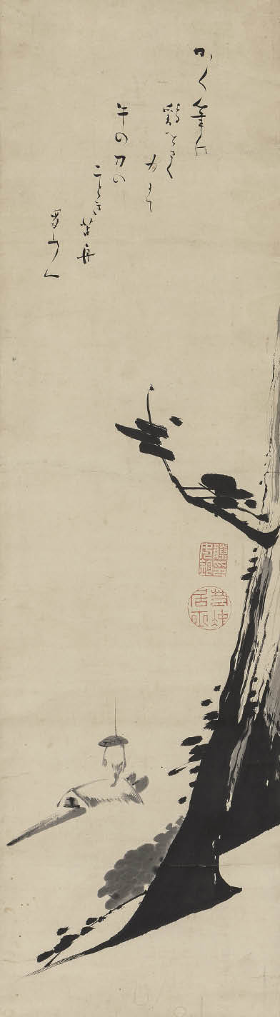 紙本・水墨 107.5×22.9cm 伊藤若冲/画面右部中央に印 大田蜀山人/画面左上に落款 軸装 箱付