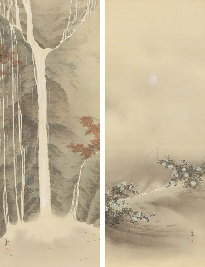 1908年頃 絹本・彩色 左幅/107.3×41cm 右幅/108.5×41cm 左幅/画面左下に落款と印 右幅/画面右下に落款と印 各軸装 共箱