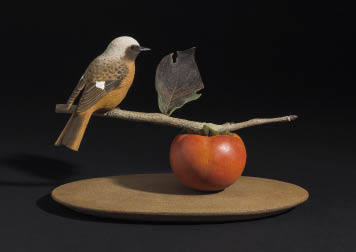 木彫に彩色 H19.8×W30×17.2cm 底部に刻銘 共箱 ガラスケース付(H40.1×W44.5×32.4cm)