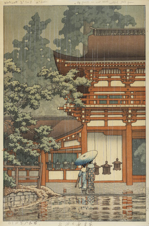 木版 36.5×24.1cm 落款と印共に版上 マージンに「版権所有 不許模寫 渡邊庄三郎」の印 マージンカット シート全体にヤケ、数ヶ所にシミ マージン1ヶ所に穴 裏面数ヶ所に紙の毛羽立ち、縁沿い数ヶ所にテープの剥し跡、1ヶ所にわずかな紙の欠損