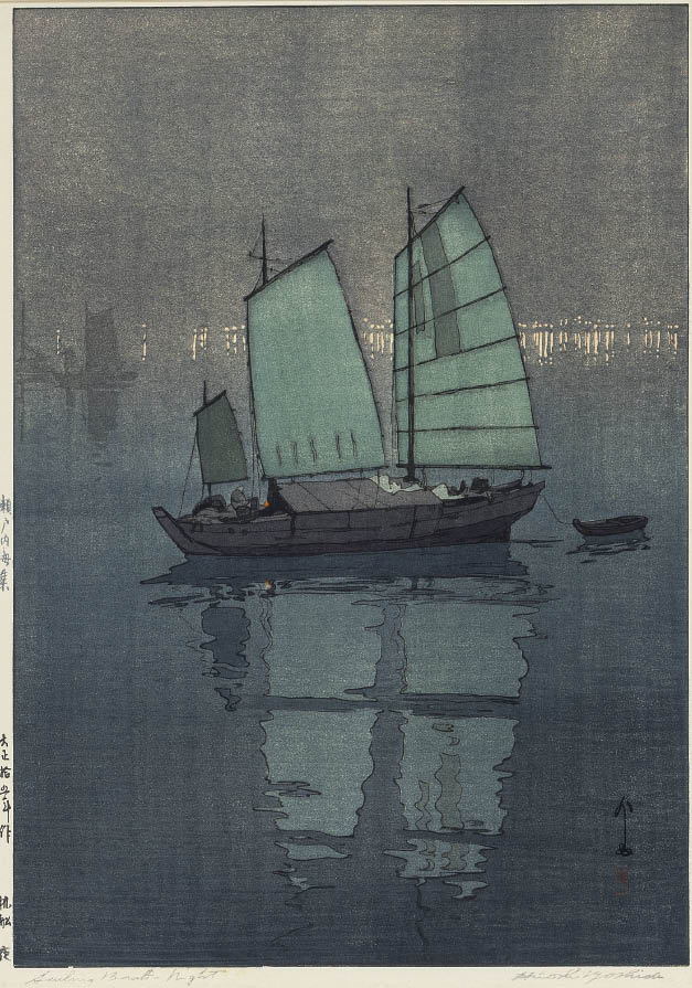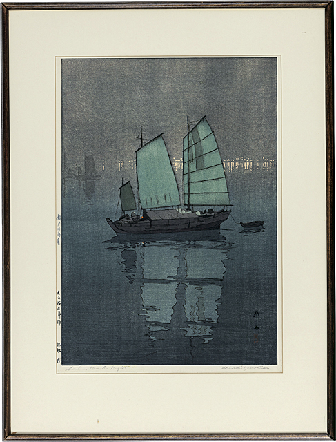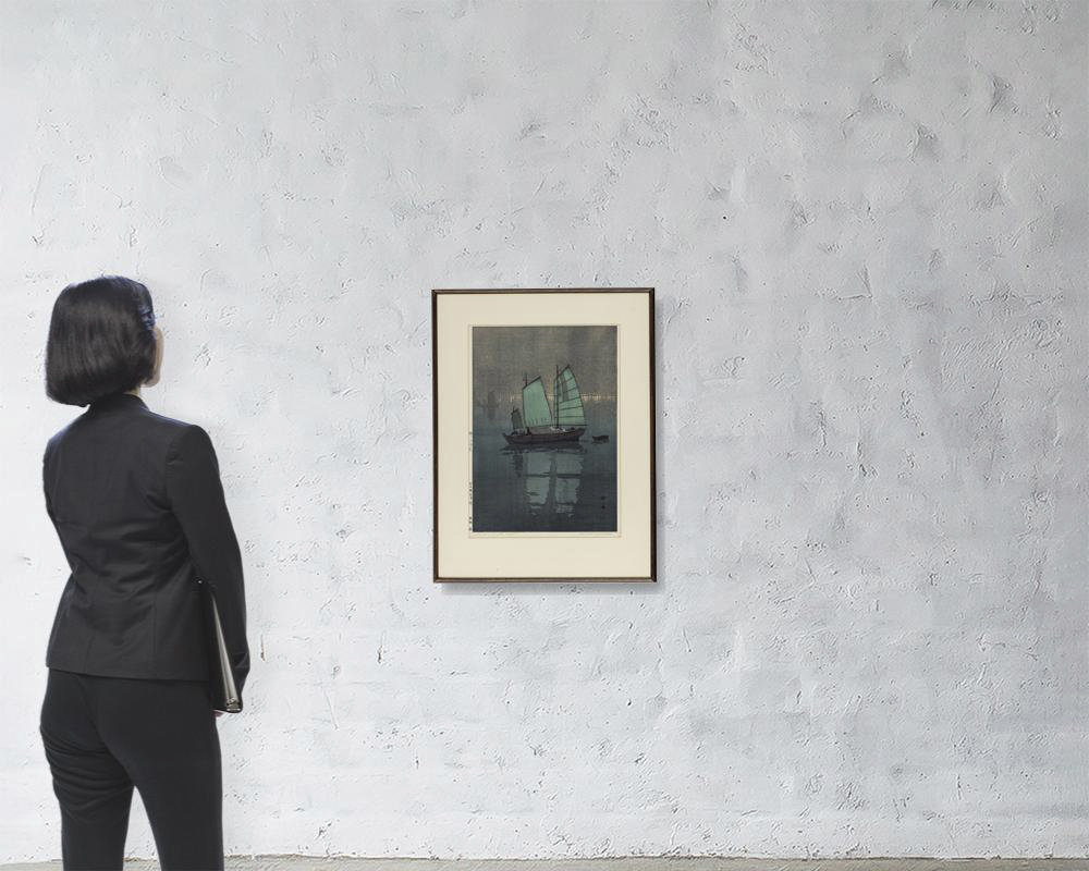 木版 50.8×36.1cm 落款と印共に版上 和紙による裏打ち 版面及びマージンに薄いヤケ マージン数ヶ所にシミ、ヨゴレ、縁沿い1ヶ所にシワ 額付