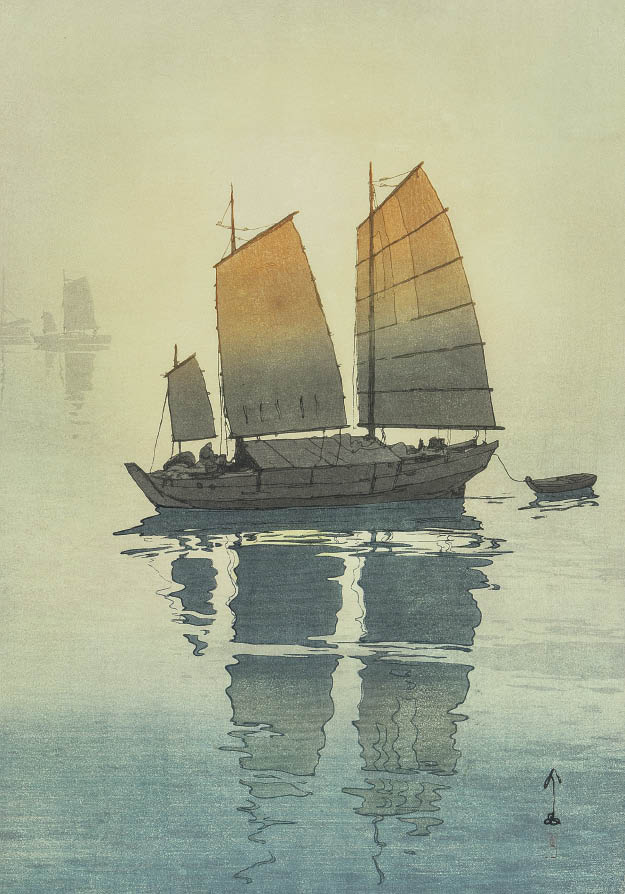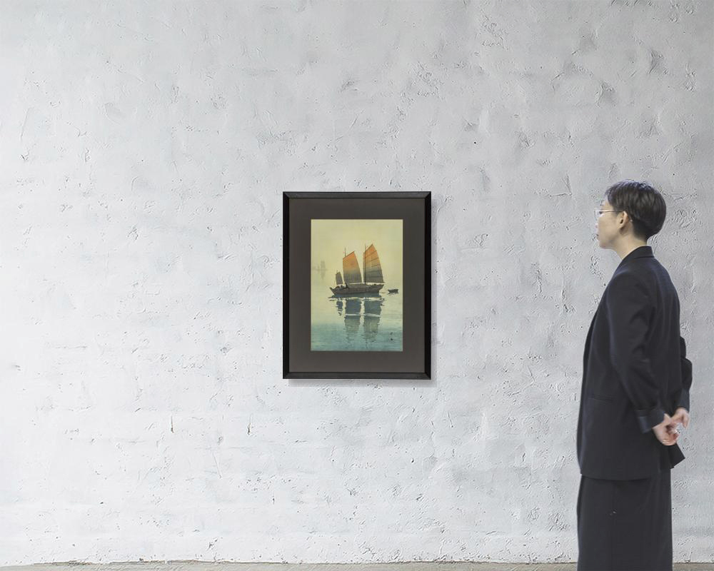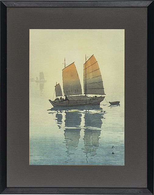 木版 50.8×35.8cm 落款と印共に版上 シートサイズ 54.2×39.3cm シート全体に薄いヤケ、わずかな波打ち 版面全体にわずかな退色、1ヶ所に修復 裏面縁沿い1ヶ所にテープの剥し跡 額付