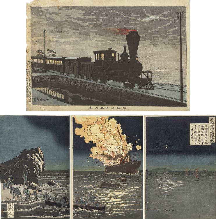 小林清親、伊東深水、河鍋暁斎他多作家による浮世絵93枚、リトグラフ3枚、春画8枚(絹本・彩色6枚、木版2枚)の104枚セット(続物数組、同図柄2枚含む) 16.3×5.3~37.7×50.7(シート)cm 数枚に落款と印共に版上、版上落款、版上印、版元印、年月印、年月改印、名主印 数枚に和紙による裏打ち 数枚の作品は裏面数ヶ所を台紙に貼付 ※詳しいコンディションについてはお問い合わせください。