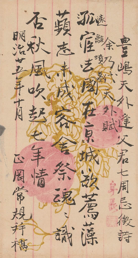 明治25年(1892年) 紙に墨 22.4×12.1cm 落款有 軸装 画面全体に薄いヤケ、数ヶ所にシミ、シワ 「高浜虚子」鑑題箱