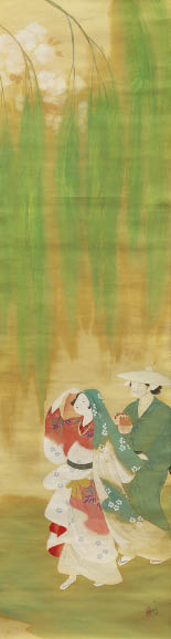 絹本・彩色 129.2×34.8cm 落款と印有 軸装 画面全体にヤケ、数ヶ所にシミ、小さな剥落 箱付