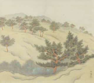 1940年 絹本・彩色 49.2×56.2cm 落款と印有 軸装 画面全体に薄いヤケ、所々にシミ 共箱