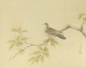 絹本・彩色 41×50.3cm 落款と印有 軸装 画面全体に薄いヤケ、所々にシミ、数ヶ所に剥落 共箱