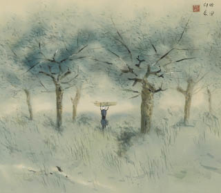 絹本・彩色 36.2×41.8cm 落款と印有 軸装 画面全体に薄いヤケ、数ヶ所に小さなシミ 共箱