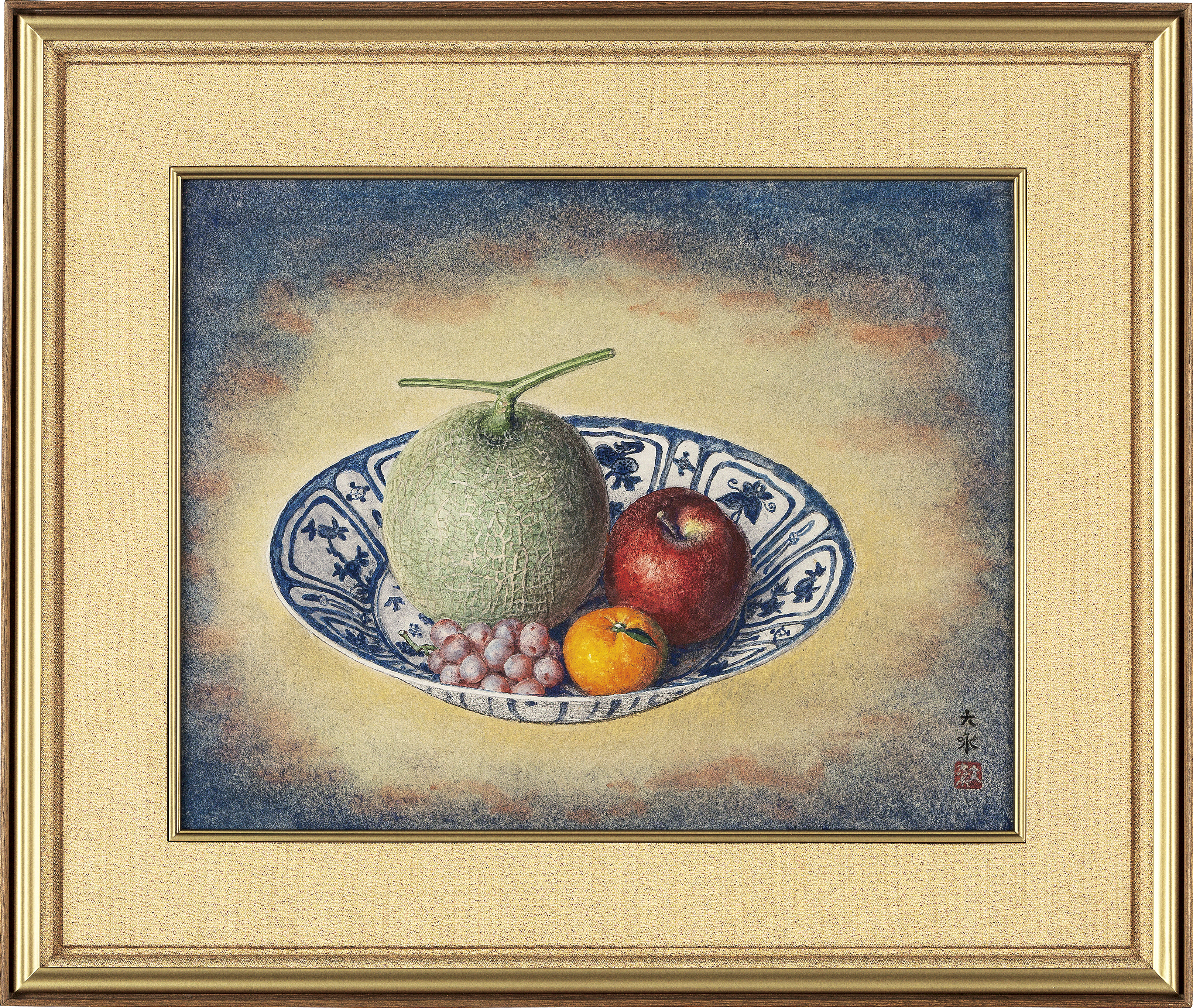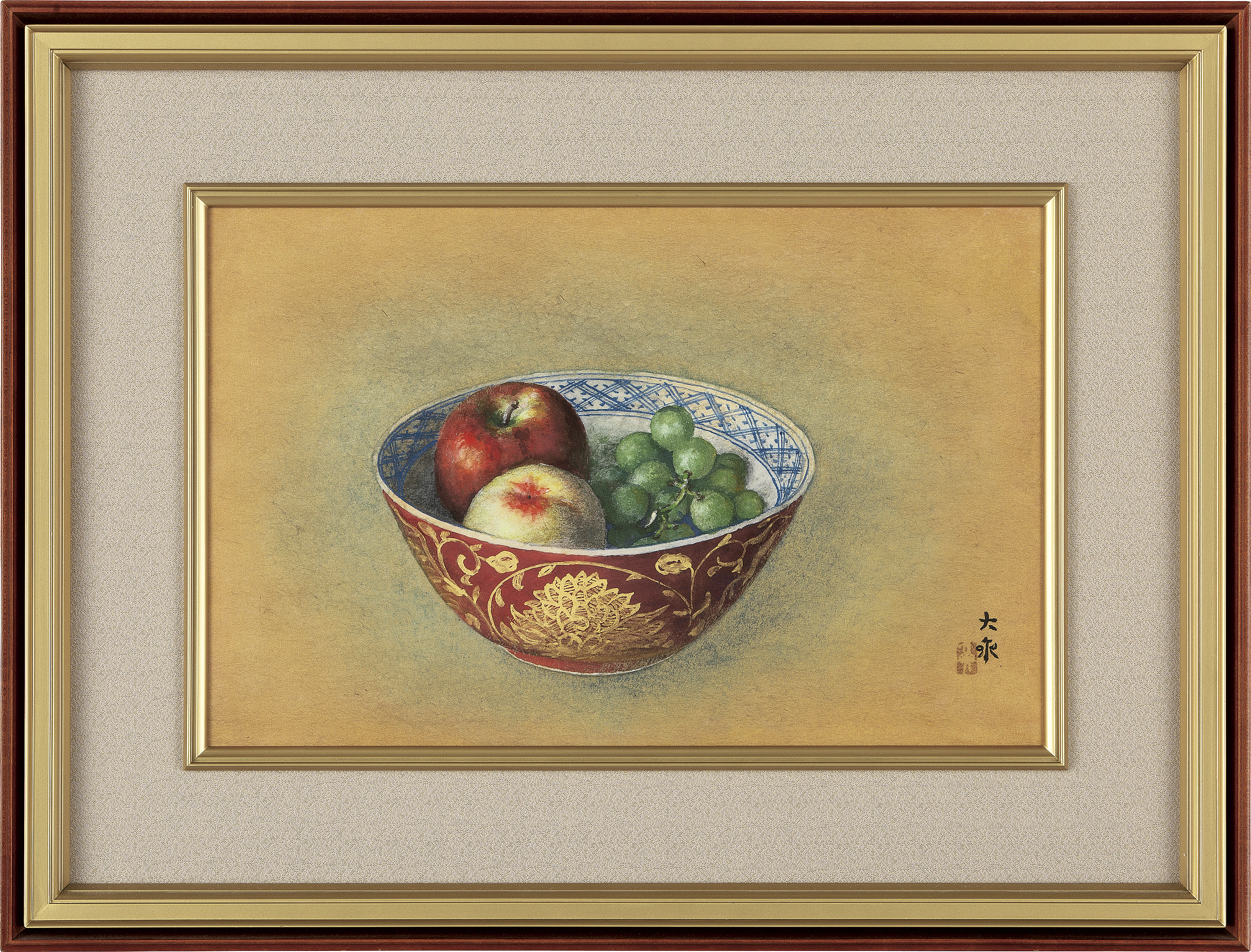 紙本・彩色 10号 落款と印有 共板付 もう1点は【金襴手鉢に果実】(8号 共シール 他は表題と同データ) 2点共額付
