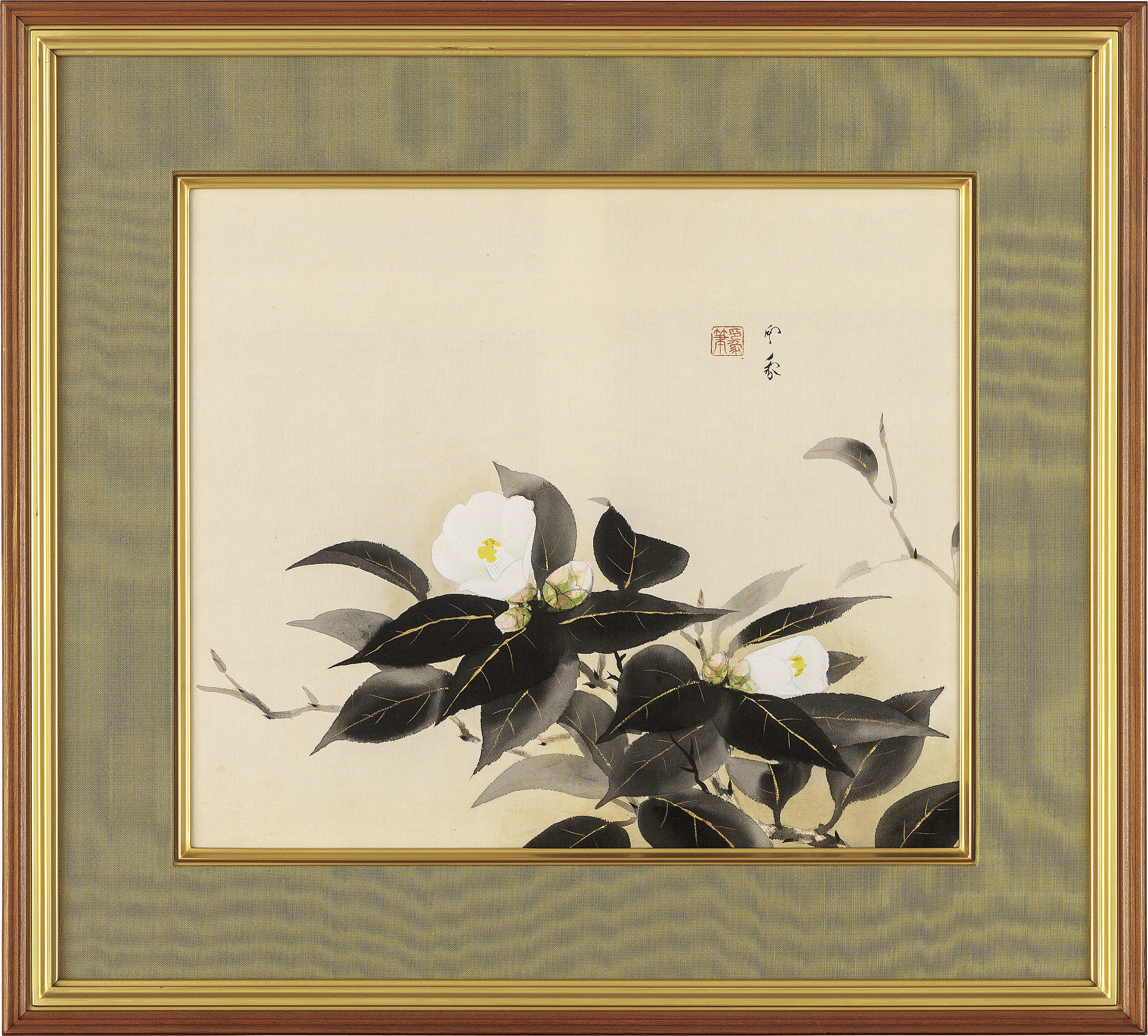 絹本・彩色 36.5×42.4cm(6号大) 落款と印有 画面全体に薄いヤケ、数ヶ所にシミ、修復 共板付 額付
