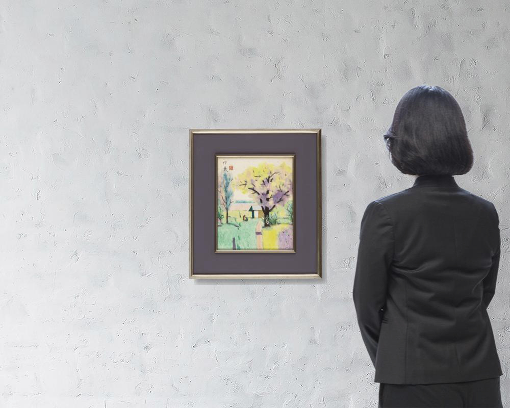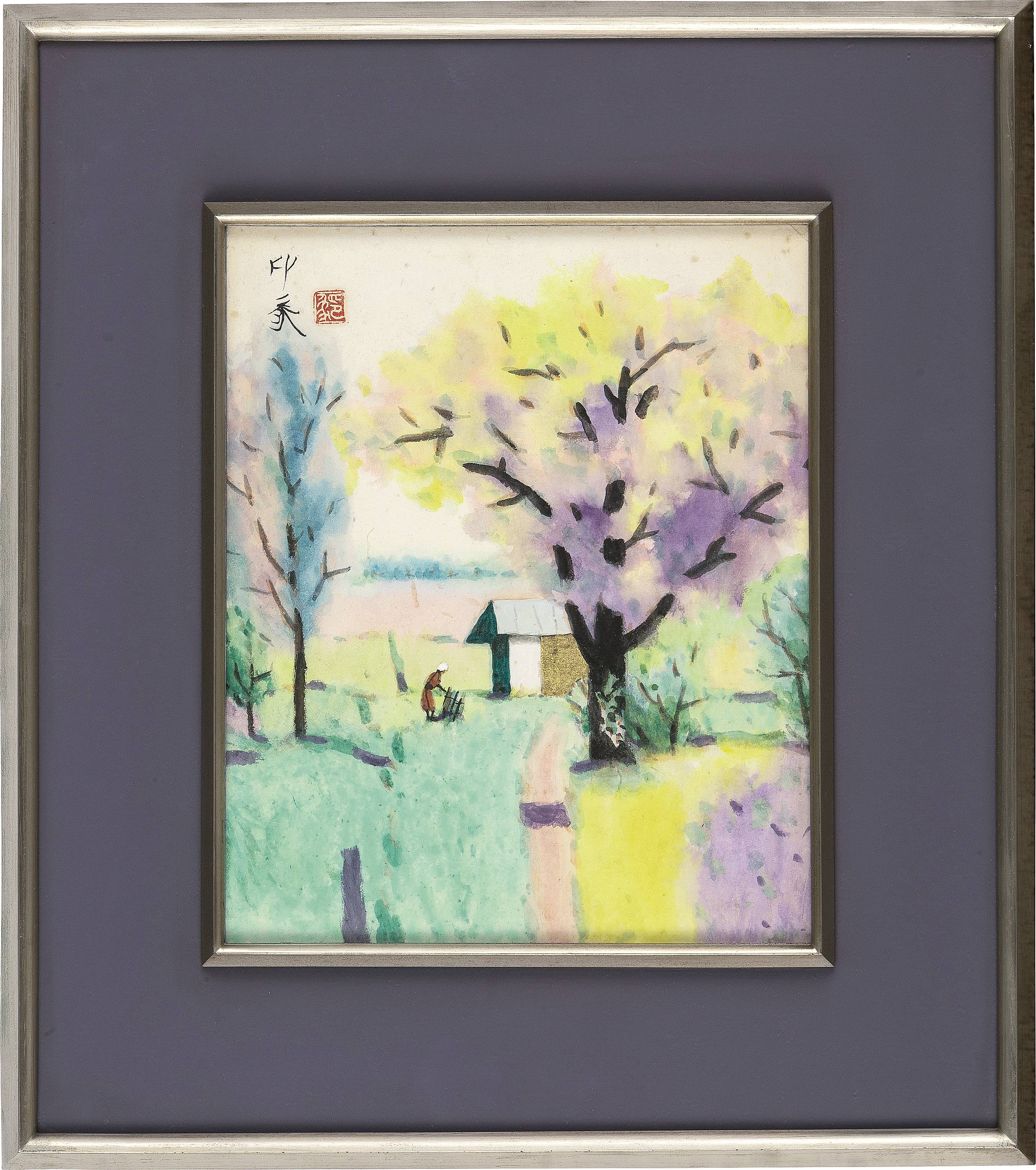 紙本・彩色 28.2×23cm 落款と印有 共シール 画面全体に薄いヤケ、数ヶ所にシミ 額付
