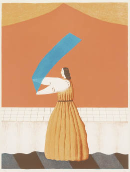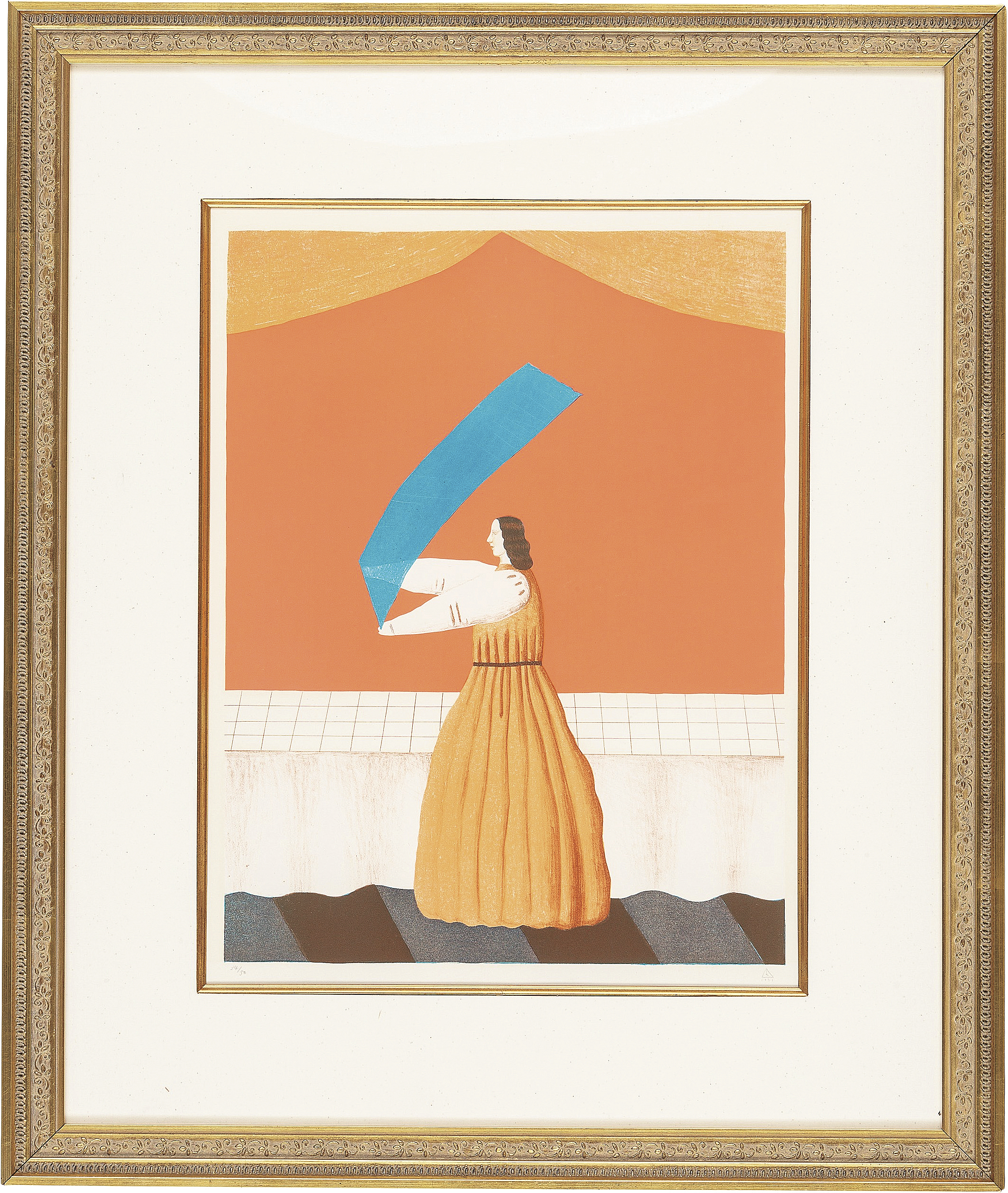 新潮社Print 13 1981年 リトグラフ 49.5×38cm サイン有 ed.50 シートサイズ 66.5×50cm(フルマージン) シート全体に薄いヤケ、数ヶ所にシミ 版面赤色部分にわずかな退色 版面及びマージン数ヶ所にシミ マージン数ヶ所にシワ 額付 「有元利夫版画登録委員会」シール