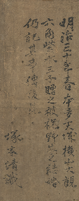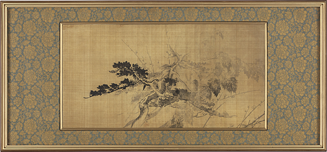 絹本・水墨 35.4×68.5cm 両名の落款と印 「横山大玄」識シール(「横山大観記念館」登録番号) 「塚本靖」識シール 画面全体にヤケ、数ヶ所にシミ、わずかなヨゴレ、絹本のヤブレ 額付