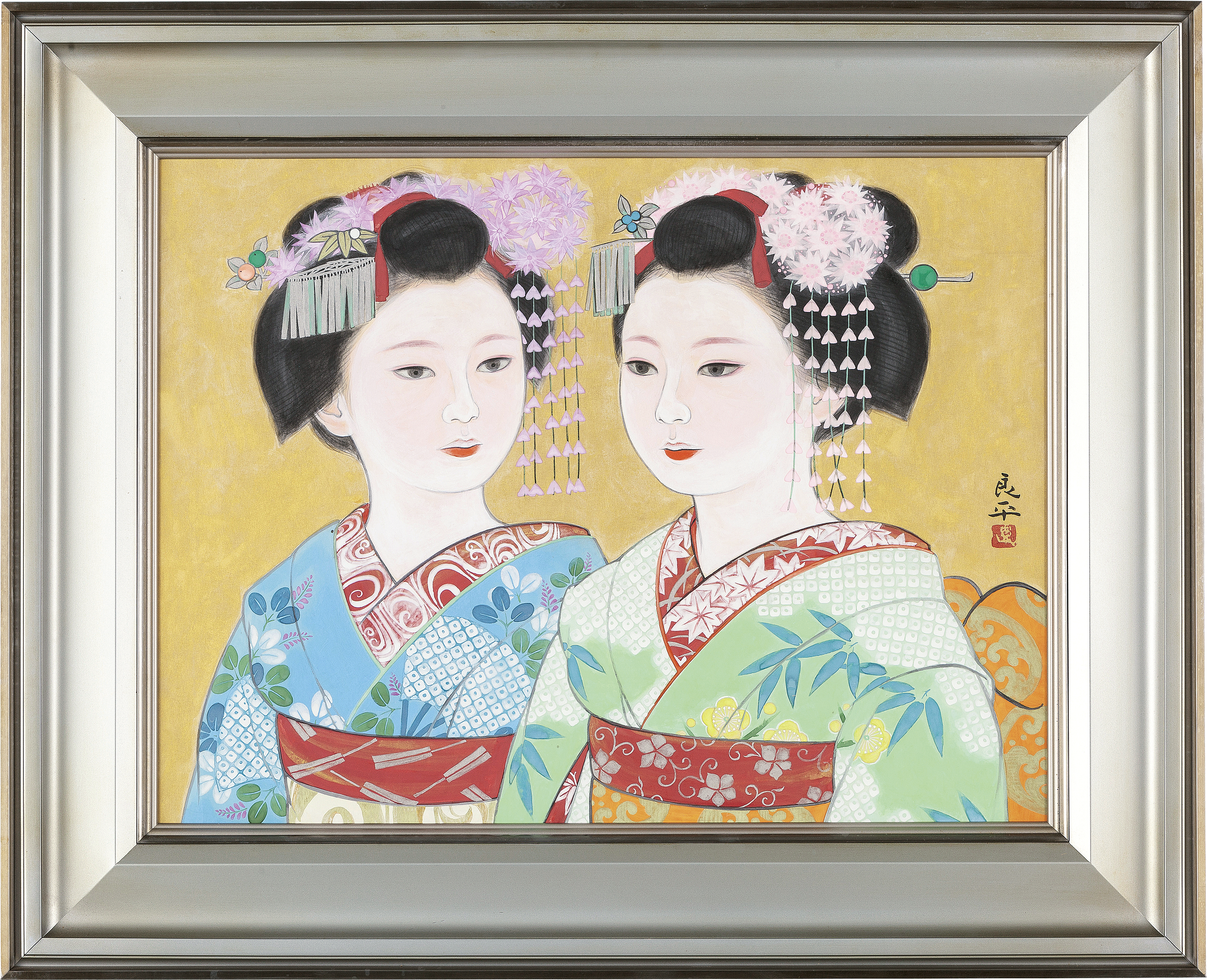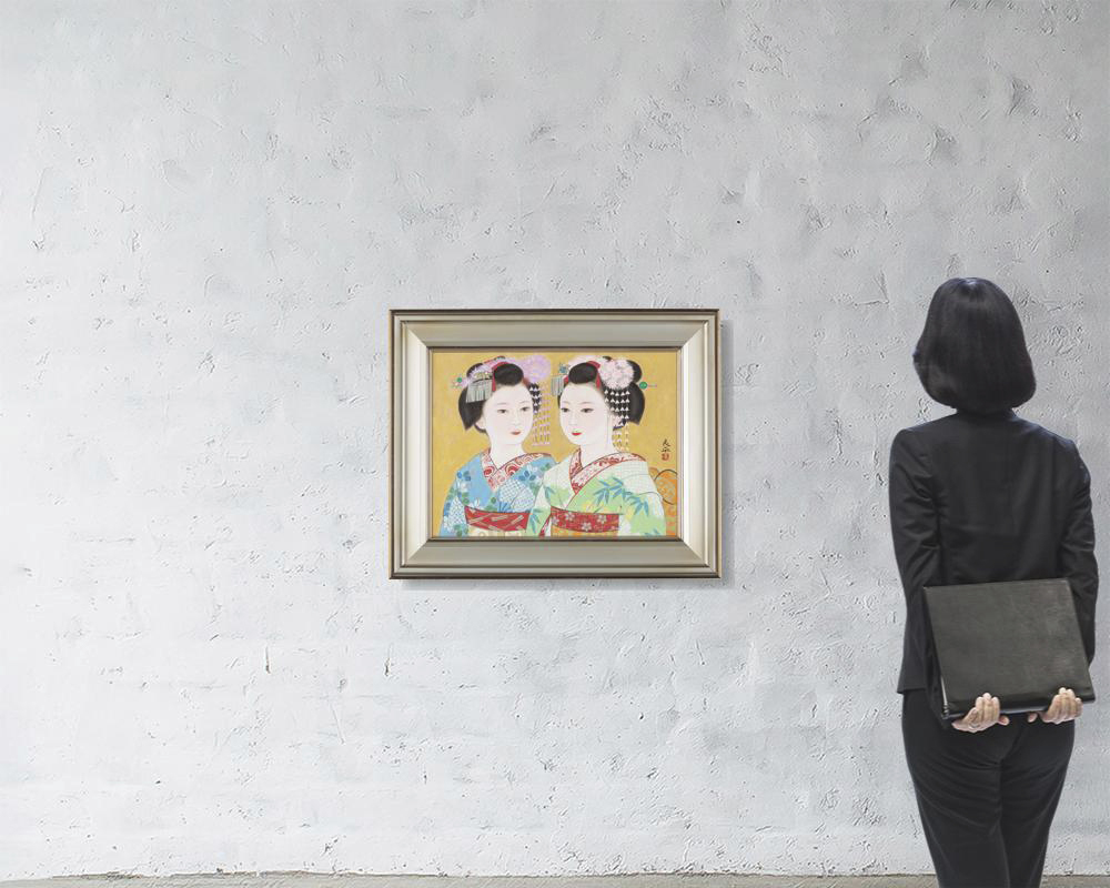 紙本・彩色 12号 落款と印有 共シール 画面数ヶ所にシミ 額付