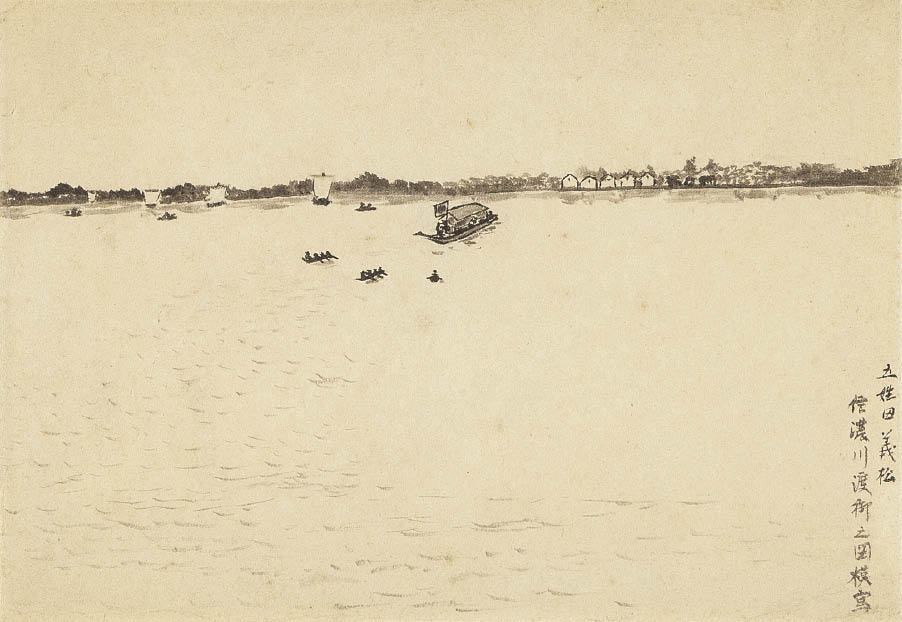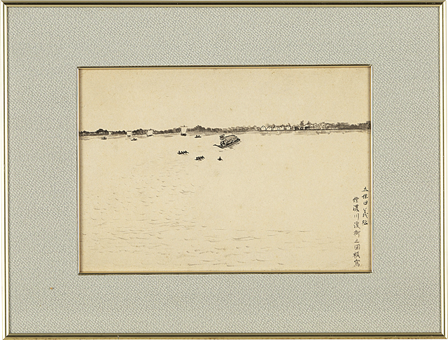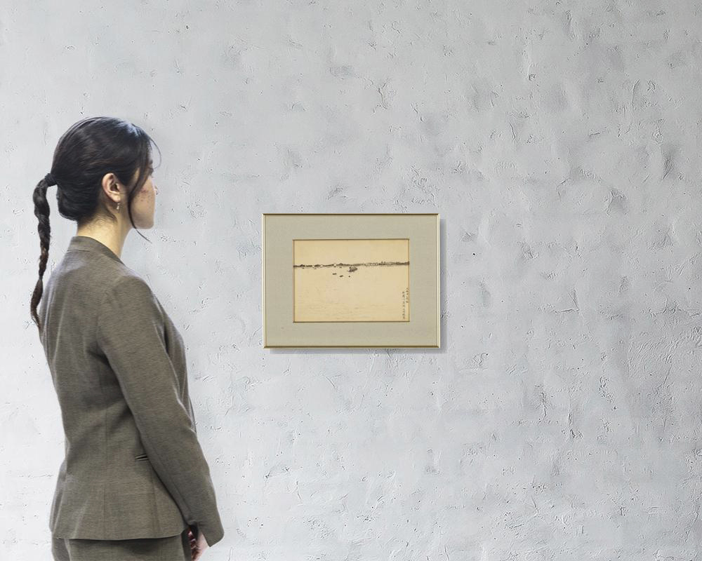 紙に墨 17.9×25.5(紙)cm サイン有 作品は裏面を台紙に貼付 画面全体にヤケ、数ヶ所にシミ、シワ、紙の毛羽立ち 額付