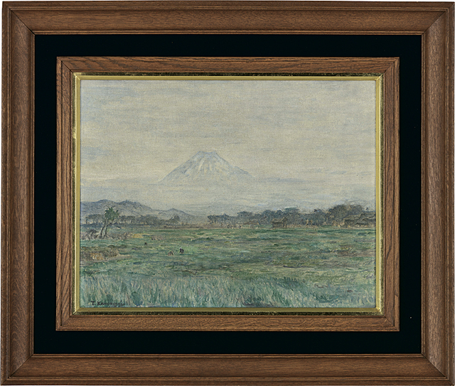 キャンバスに油彩 F6号 サイン有 キャンバス裏木枠にもサインと印、タイトル キャンバスによる裏打ち もう1点は【駿河湾上ノ富士】(油彩 F4号 サイン有 キャンバス裏木枠にもサインと印、タイトル 画面数ヶ所に点状のシミ、縁沿い数ヶ所に剥落、隅2ヶ所にピンホール) 2点共額付