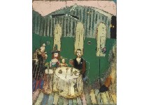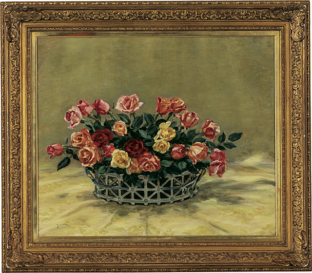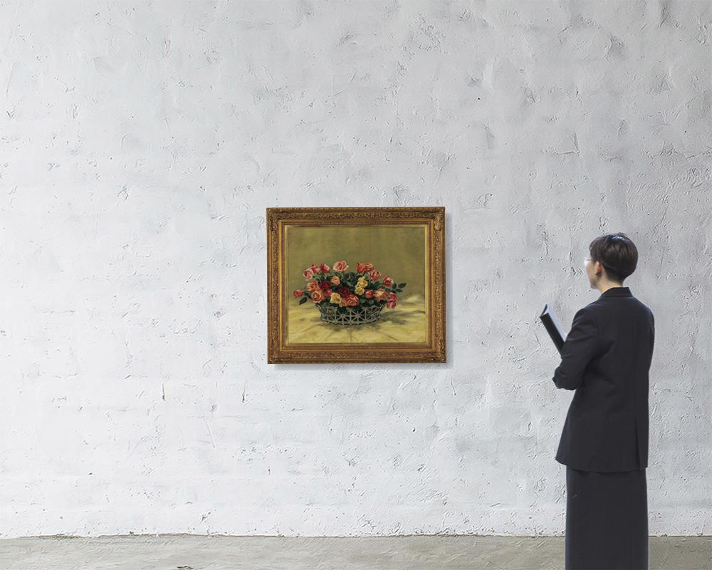 キャンバスに油彩 F20号 サイン有 キャンバス裏木枠にもサイン、タイトル 画面所々に浅いヒビ、1ヶ所にヨゴレ 額付
