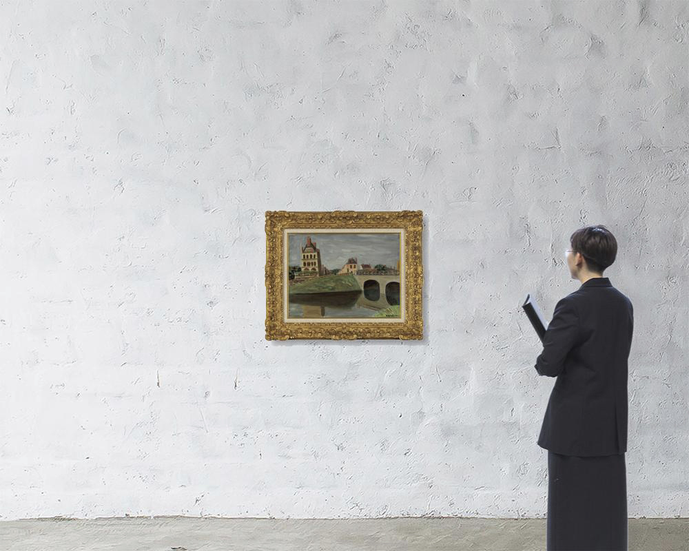 1928年 キャンバスに油彩 45.2×60.5cm(P12号) サイン有 キャンバス裏にもサイン、タイトル、年記 「日動画廊」シール 画面数ヶ所に小さなシミ、縁沿い数ヶ所にヒビ 額付