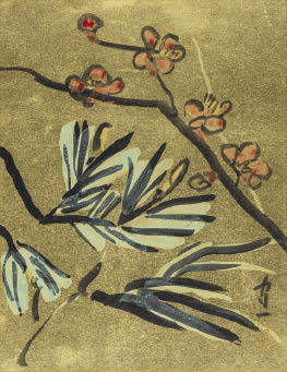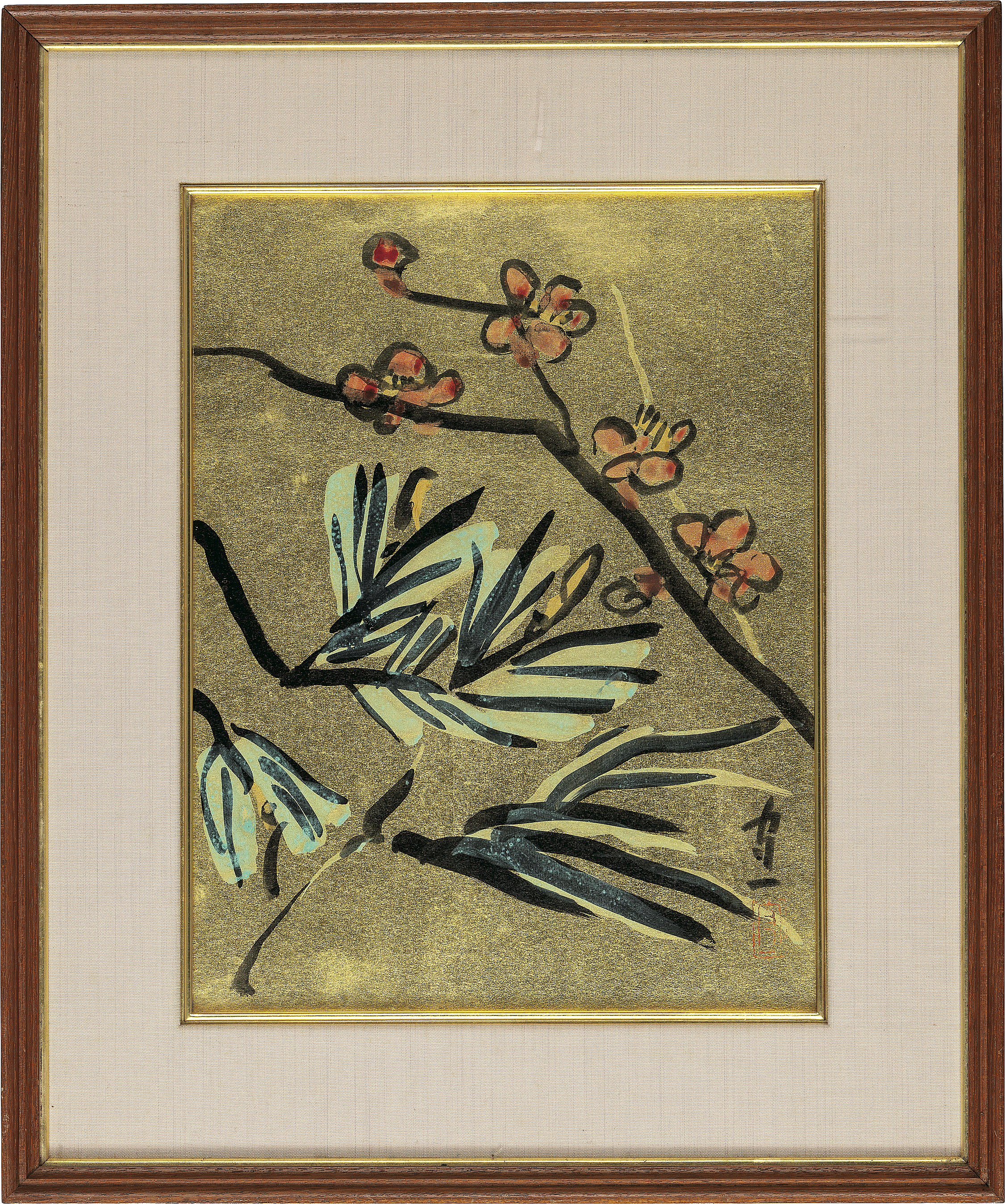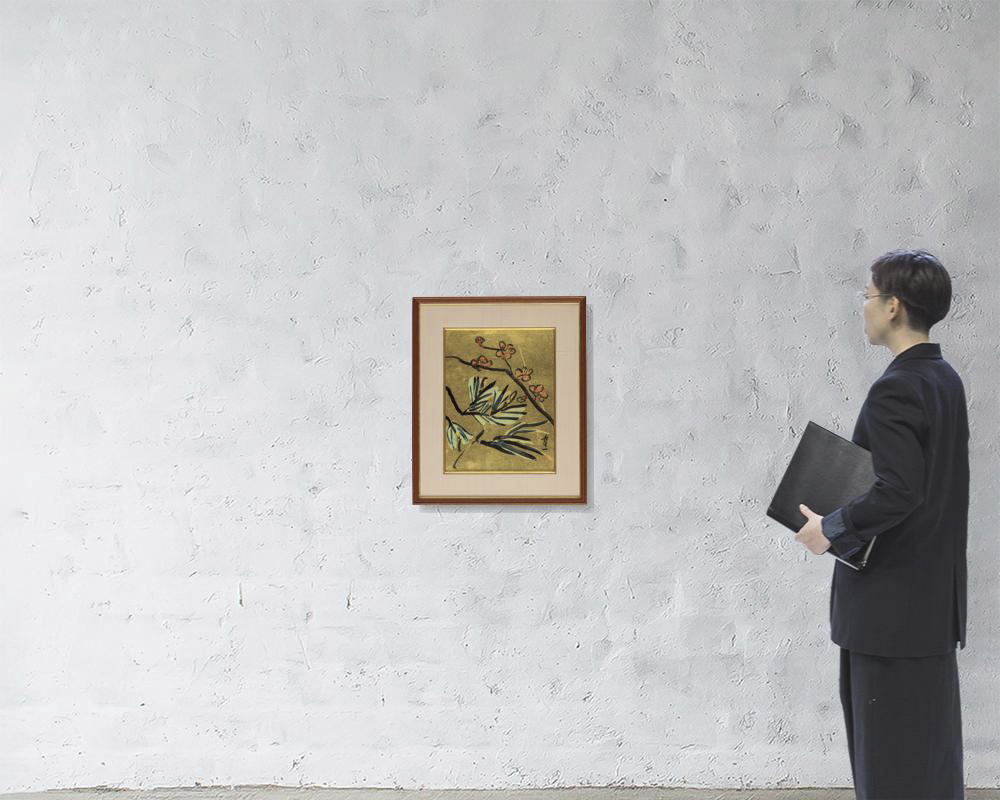 金地紙本に水墨淡彩 39.4×30.2cm 落款と印有 共シール 画面2ヶ所に修復 額付