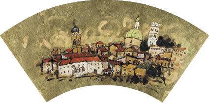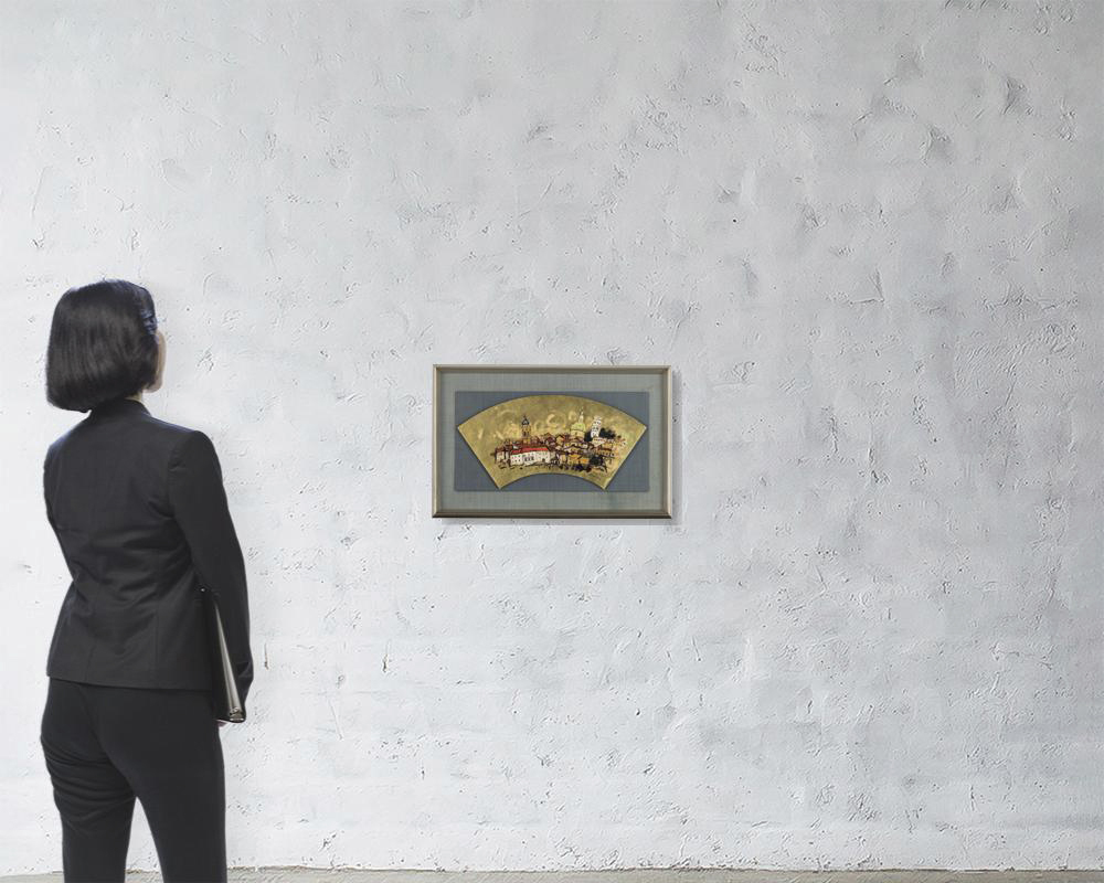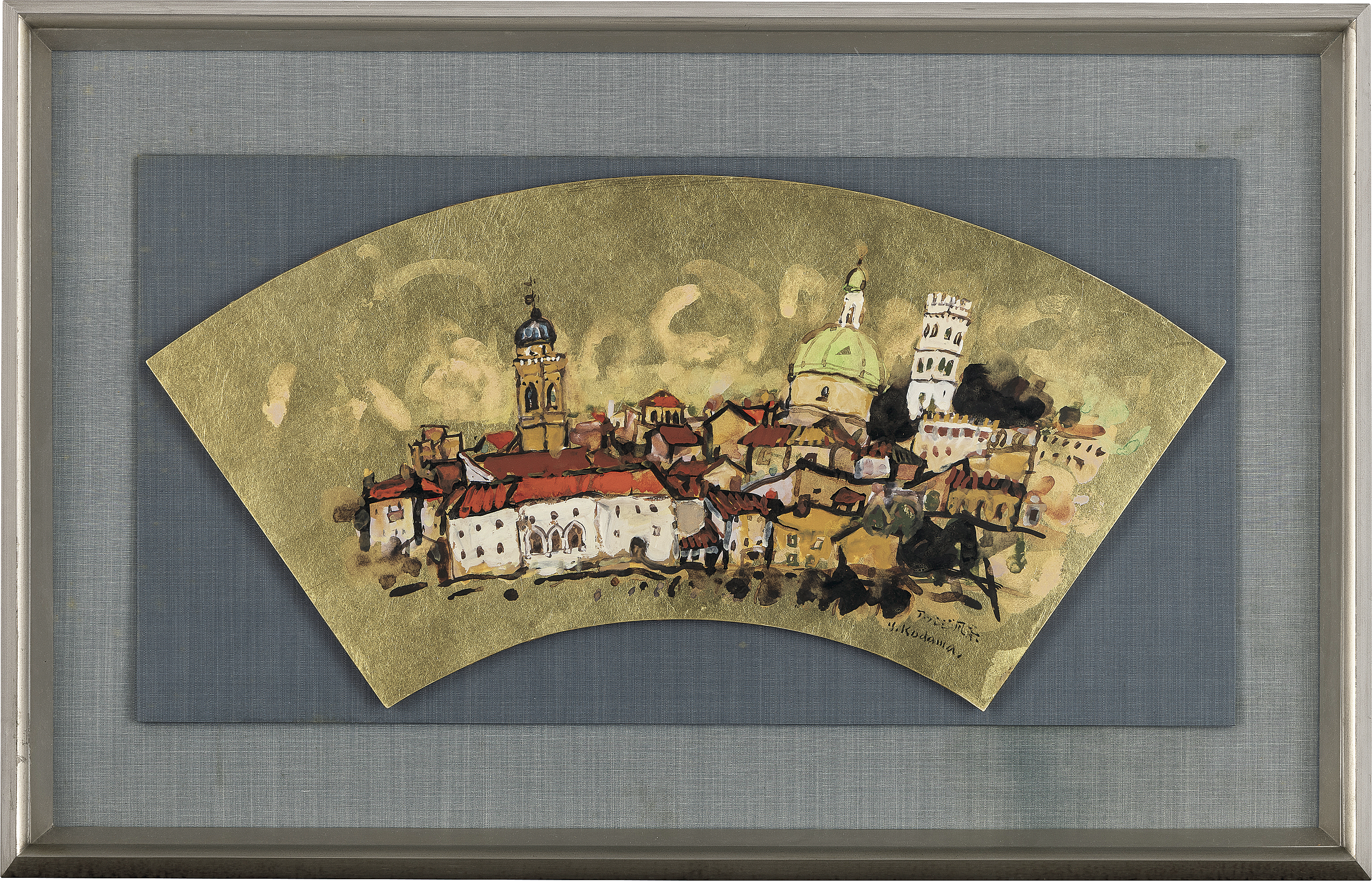 パネルに金箔・グワッシュ 18.3×46.4(扇面型)cm サイン有 画面数ヶ所に絵具の縮み、絵具の浮き、剥落 額付*