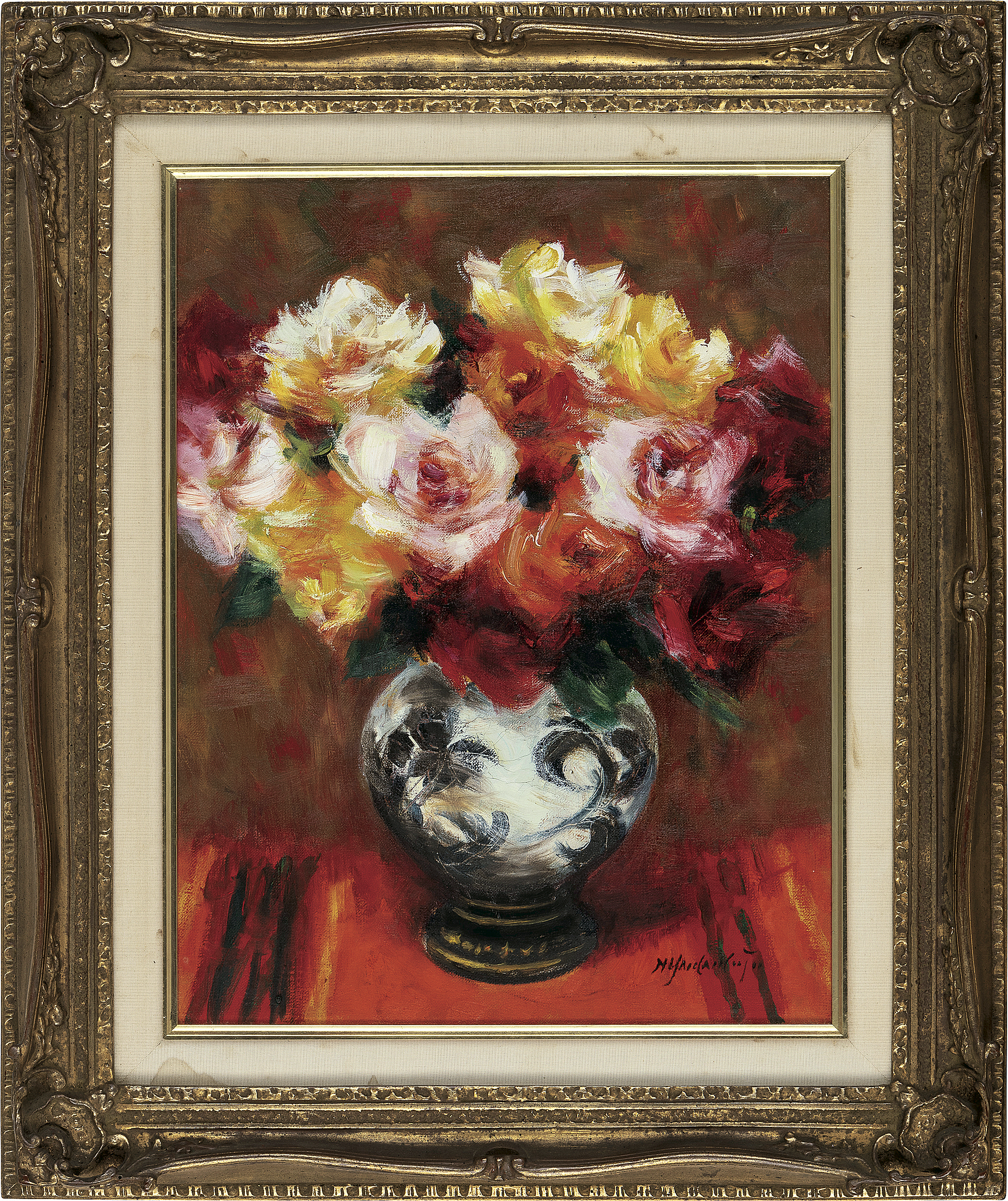 キャンバスに油彩 F6号 サイン有 キャンバス裏にもサイン 画面数ヶ所にヒビ、わずかな絵具の浮き 額付