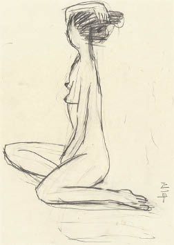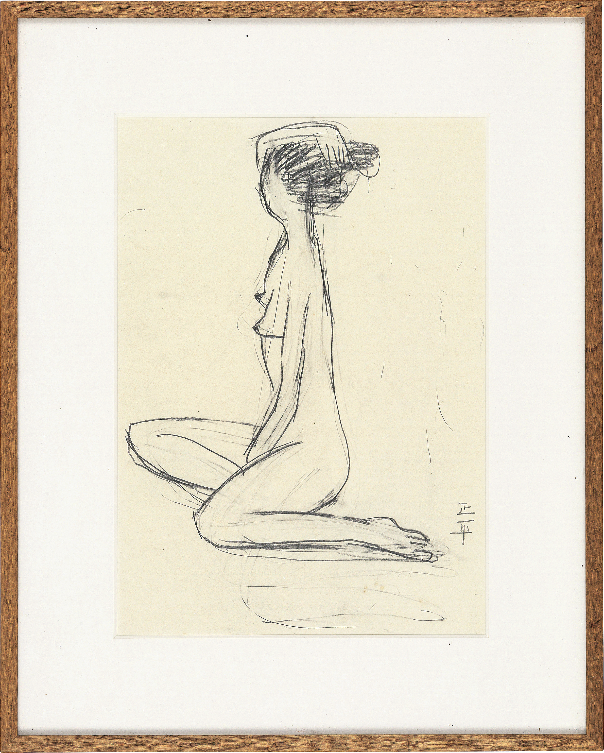 紙に鉛筆 34×25(紙)cm サイン有 スケッチブックに描かれた作品 紙裏に鉛筆によるドローイング 画面全体にヤケ、数ヶ所にシミ 額付
