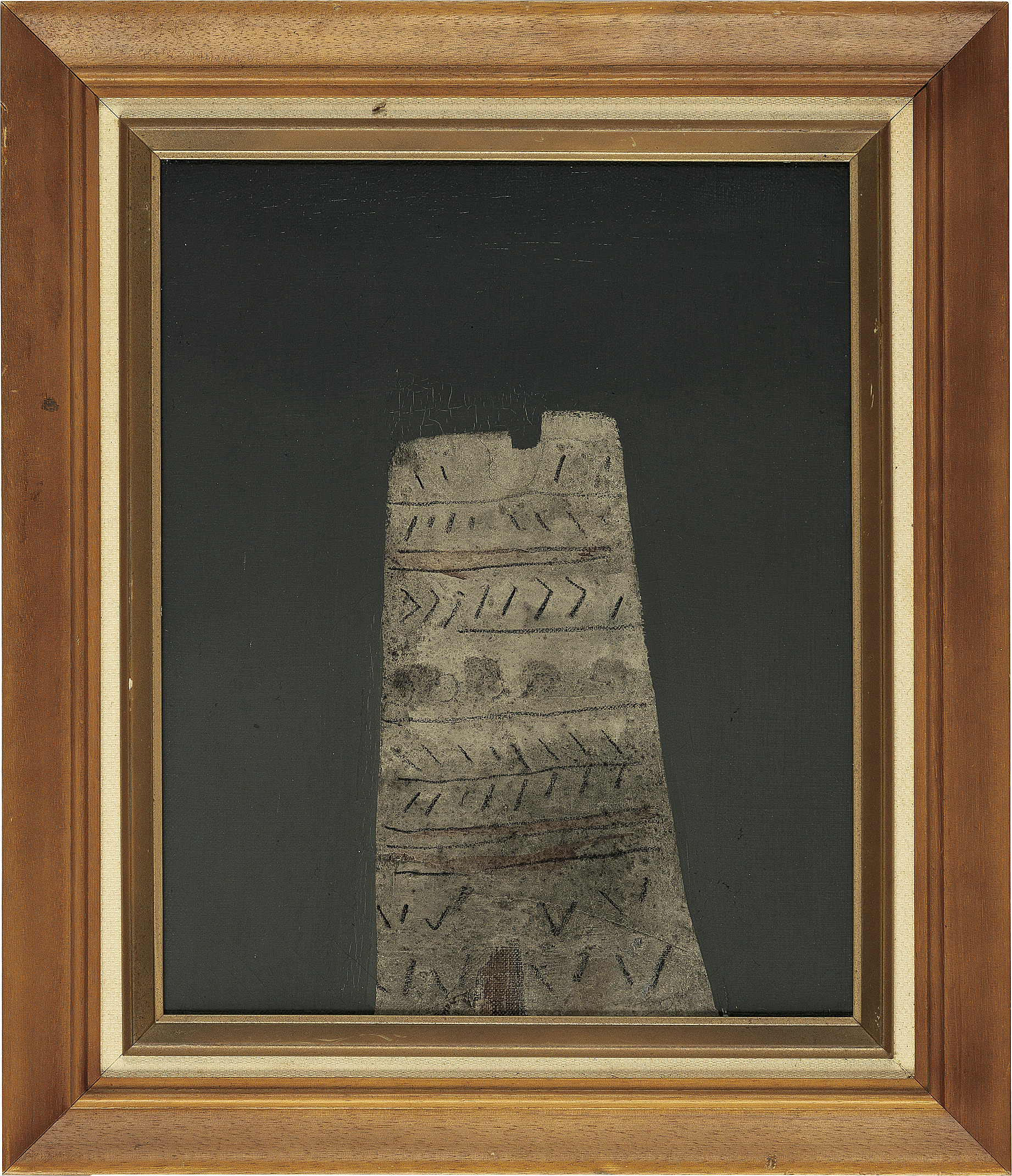 キャンバスに油彩 F3号 キャンバス裏にサイン、タイトル 画面数ヶ所に絵具の縮み、浅いヒビ 額付